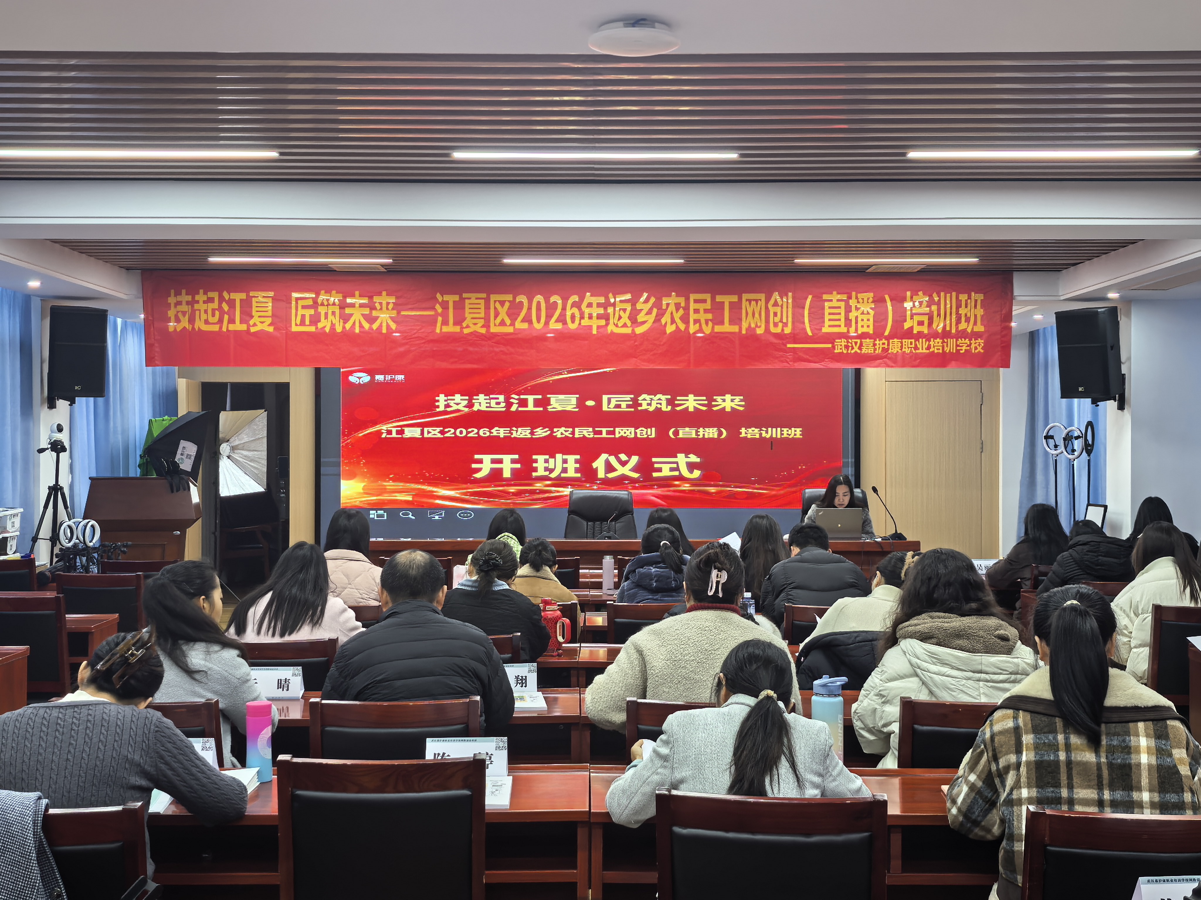 近日,由武汉市江夏区人社局劳动就业服务中心联合武汉嘉护康职业培训学校举办的“技起江夏 匠筑未来”返乡农民工网创(直播)培训班圆满收官。30名学员经过8天系统学习,从“直播小白”成长为“准主播”,踏上创业就业新征程。