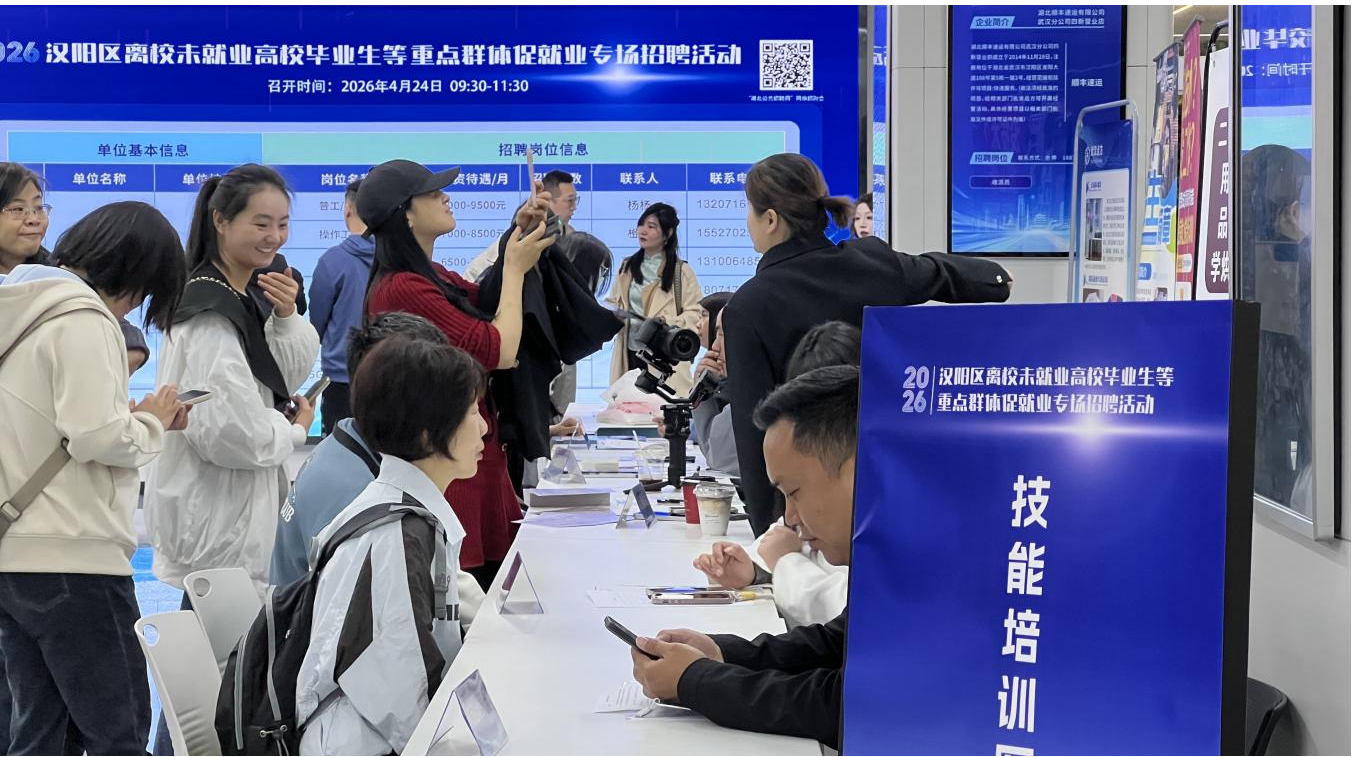 4月24日上午,“才聚汉阳 职引未来”——汉阳区2026年离校未就业高校毕业生等重点群体促就业专场招聘活动,在中国武汉人力资源服务产业园汉阳园区圆满举行。本次活动旨在统筹辖区内有效资源,打造 “招培就”一体化就业服务模式,激活职业技能培训促就业新动能。