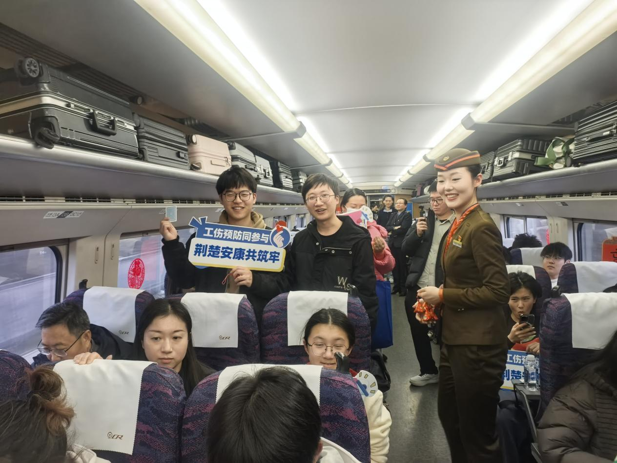 此次返岗专列上的工伤预防宣传活动,是湖北省人社厅2026年工伤预防宣传工作的生动实践,也是湖北将权益保障融入就业服务、把工伤预防送到劳动者身边的创新举措。春节前后,针对节后劳动者集中返岗就业的特点,湖北省人社厅在湖北省范围内推出一系列工伤预防宣传创新举措,织密线下宣传网络:在黄石、荆州等地的大型招聘会设立政策咨询区、趣味互动区,为求职者和用人单位现场答疑;在武汉、汉口、武昌高铁站及武汉地铁专列打造沉浸式宣传阵地,通过主题展板、滚动视频、公益广告等形式,让工伤预防知识随处可见。