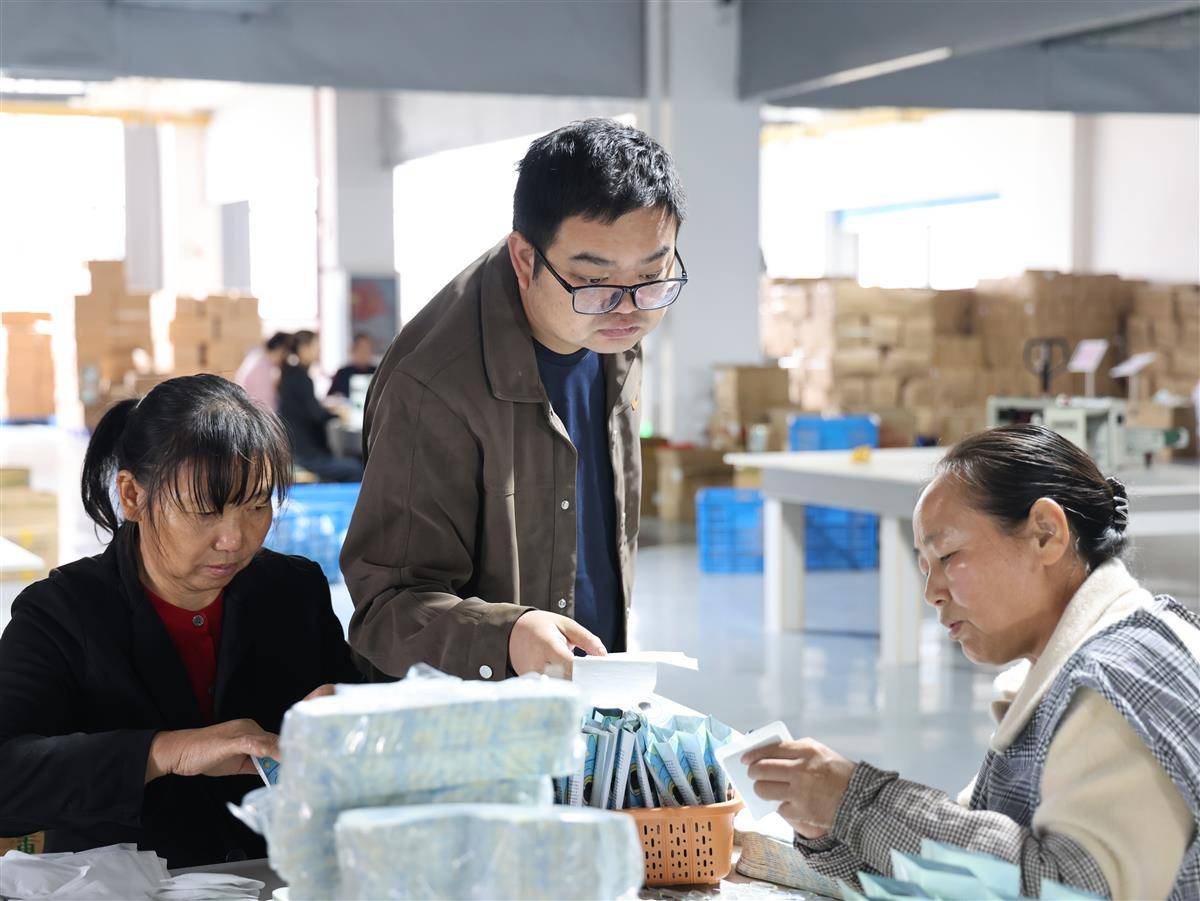 楼下,12条生产线全速运转,工人们动作麻利地分装、打包、贴单,日均发货超万单。