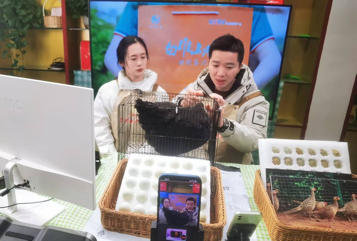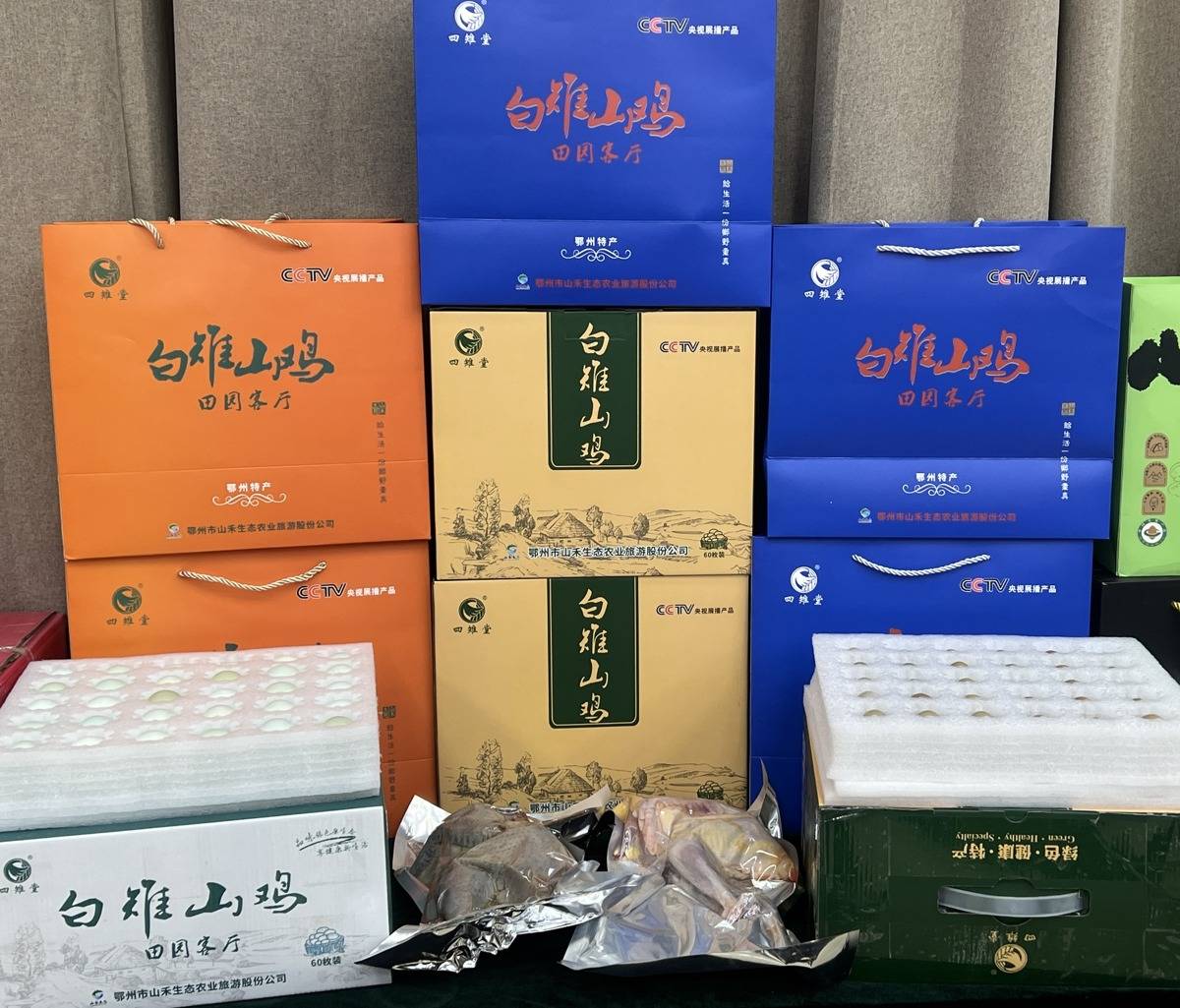 鄂州市山禾生态农业旅游有限公司负责人杨旭正和员工麻利地打包年终福利礼包。真空包装的白雉山鸡、圆润饱满的山鸡蛋与豆豉糍粑等本地特产整齐码放,快递单上的地址从湖北辐射至江浙沪、深圳等地。手机屏幕一侧,“白雉山鸡田园客厅”的抖音直播热度正酣,镜头切换间,山林间戴特制眼镜的鸡群、生态养殖的真实场景引得网友纷纷下单。