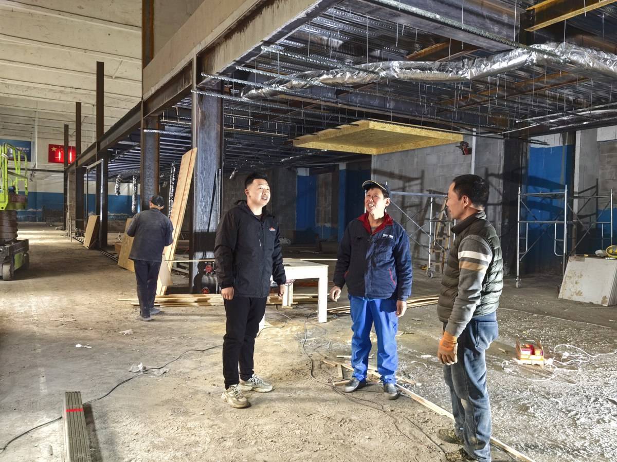 邱明(左一)查看新店装修情况。