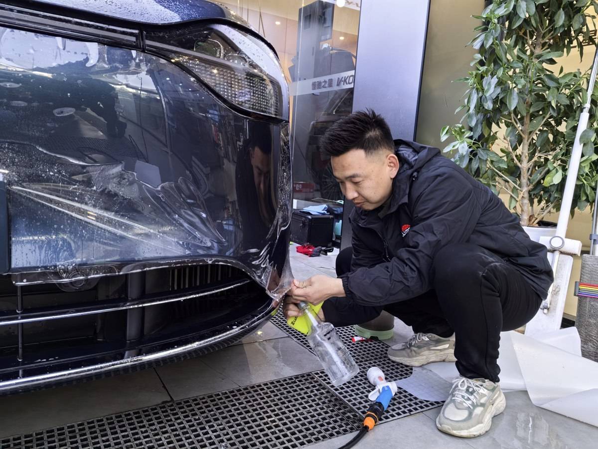 1月29日,在随州高新区“恒驰之星”汽车服务门店,邱明正俯身在新车前专注操作,手中的刮板平稳划过车身,一张隐形车衣如皮肤般平整地贴合其上。阳光透过门店玻璃窗洒落,映得他短发间藏不住的军旅印记愈发鲜明。