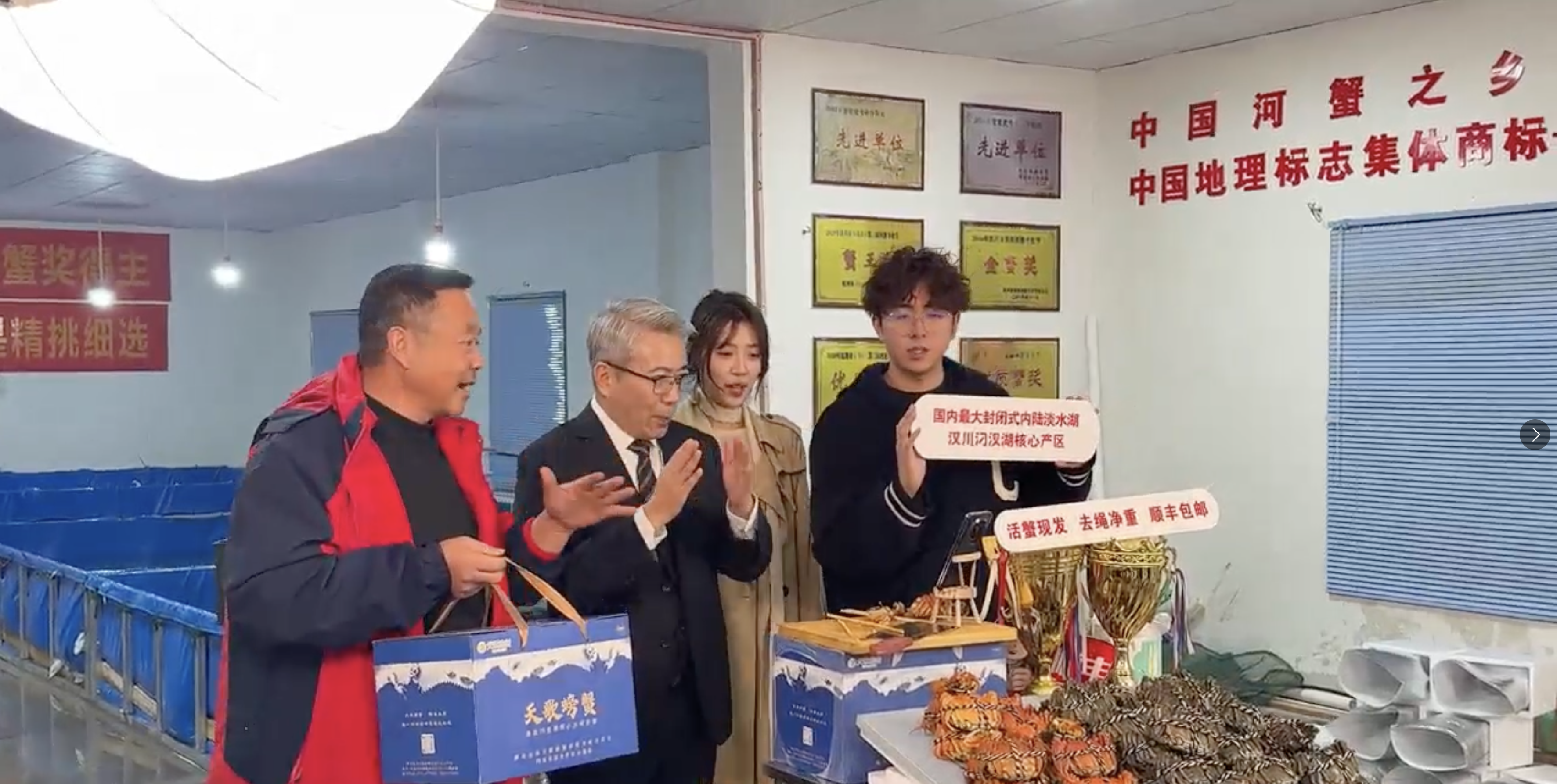 “谷哥”徐志新在汉川天歌螃蟹养殖专业合作社基地直播。
